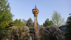 The tower is located next to Tangled Tree Tavern, a restaurant in Fantasyland. It also appears in the Tangled-themed mosaic in Enchanted Storybook Castle.